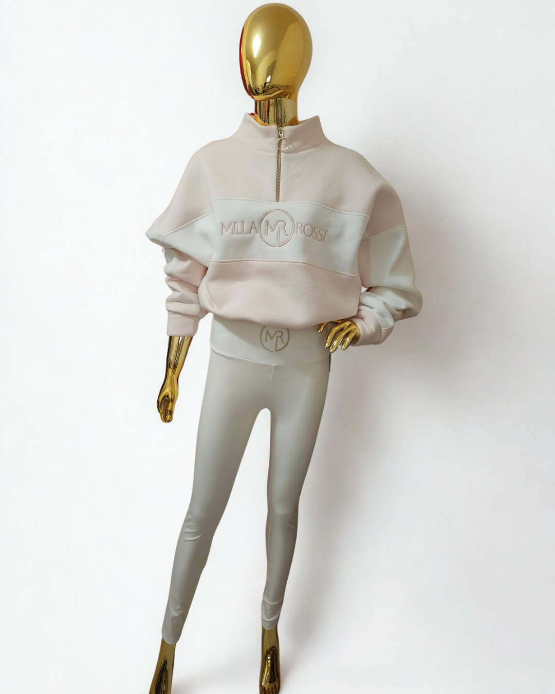 Bluza pudrowo- śmietankowa z wyszywanym logo, złoty zamek do połowy oraz ściągacze do regulacji.