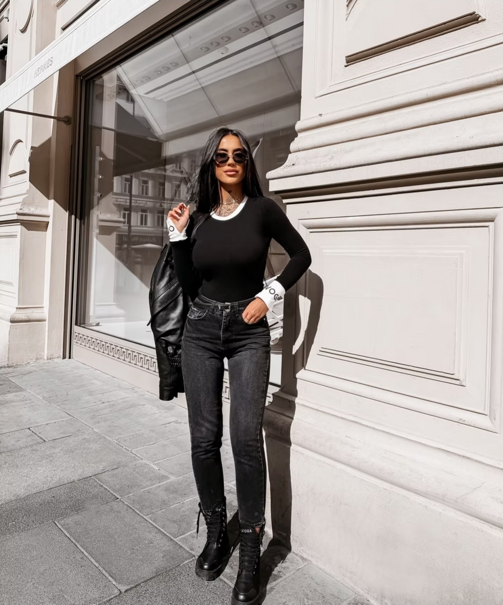 Stylowa bluzka firmy Olavoga czarna z białymi rękawami i nazwą producenta.
